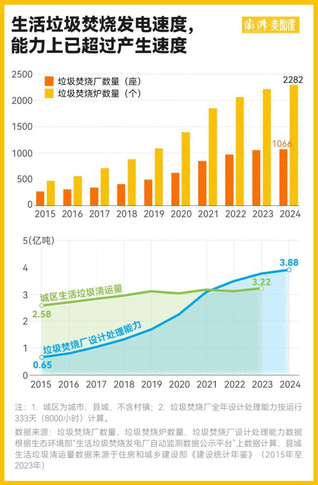 现在许多城市已不再需要生活垃圾填埋场,垃圾去哪了?答案是烧掉了。在西安灞桥江村沟垃圾填埋场封场的同一年,焚烧反超卫生填埋,成为国内城区生活垃圾的第一大处理方式。到2023年,城区的生活垃圾中有78.3%都是焚烧处理掉的,卫生填埋量占比已下降到了13.2%。