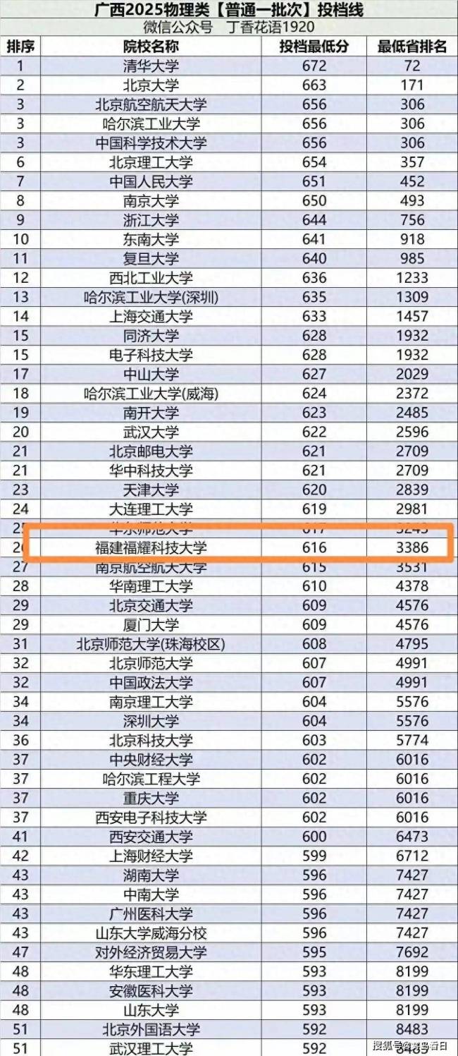 福耀科技大学在湖南投档线比肩厦大 高分认可强劲竞争力!2025年福耀科技大学在部分省份的投档线很高,呈现出比肩甚至超越部分985大学的情况。7月18日,广西招生考试院公布的本科批物理组最低投档分数线显示,福建福耀科技大学以616分的成绩远超当地物理类特殊类型招生控制线(495分),且超过多所985高校的投档分数,引发社会广泛关注。作为曹德旺捐资100亿创办、王树国担任校长的新型研究型大学,其首年招生即展现出强劲竞争力。