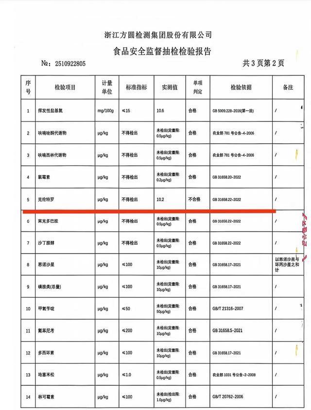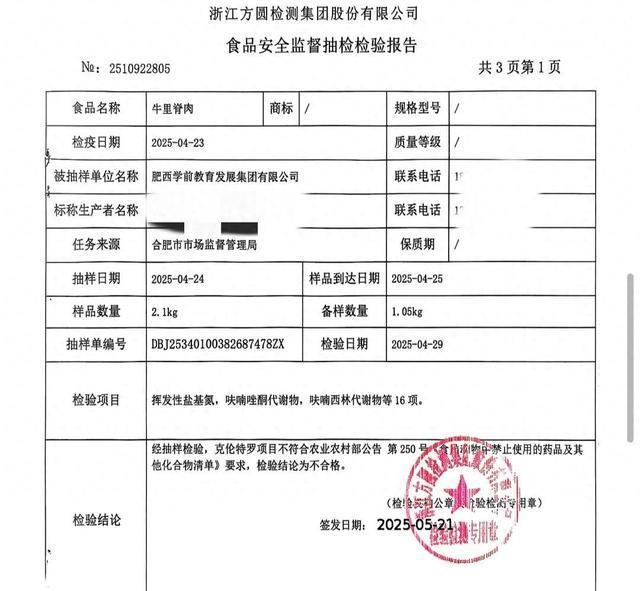 合肥市市场监管局今年4月对两家公司的牛肉进行了检查,结果检测出了国家明令禁止的“克伦特罗”,即俗称的“瘦肉精”。其中一家被检查抽样单位是肥西学前教育发展集团有限公司,该公司被检测的是牛里脊肉,样品中“克伦特罗”的数量值为10.2μg/kg。另一家被检查抽样单位是安徽联家供应链管理有限公司肥西分公司,样品为牛后座肉,“克伦特罗”的数量值为1.42μg/kg,两份样本均不合格。
