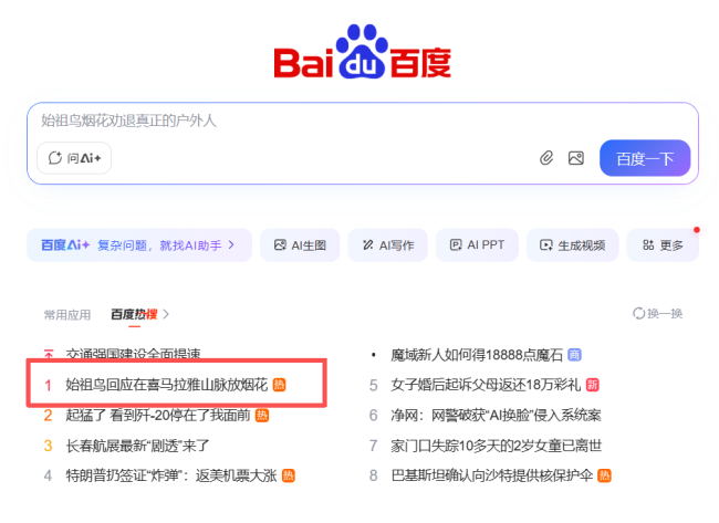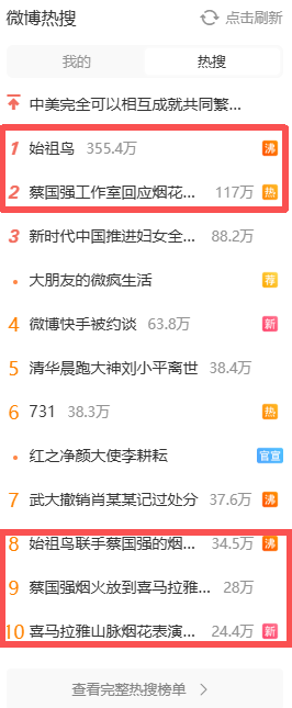 近日,户外品牌始祖鸟联手艺术家蔡国强在喜马拉雅山脉燃放艺术烟花引发争议。相关话题“始祖鸟”冲上微博热搜第一,相关5个话题均跻身微博热搜榜前十;同时,相关话题也登上百度热搜第一。