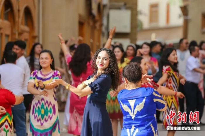 身着艾德莱斯绸的姑娘们欢快地跳着舞蹈。许晓龙摄 摄