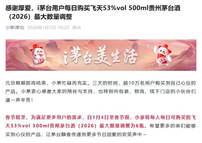 此前,在2025年12月31日晚间,“小茅i茅台”曾发布消息称,从2026年1月1日起,飞天53%vol 500ml贵州茅台酒将在i茅台上架开售,每人每天可以购买12瓶。