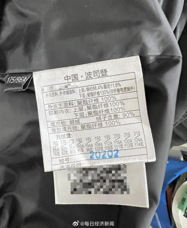 波司登2299元羽绒服充绒量86克!近日,一位江苏网友发帖称,在波司登门店购买的一款售价2099元的羽绒服,充绒量仅为86克,质疑品牌溢价过高。根据水洗标图片显示,该衣服尺码为“175”,对应的充绒量为86克。