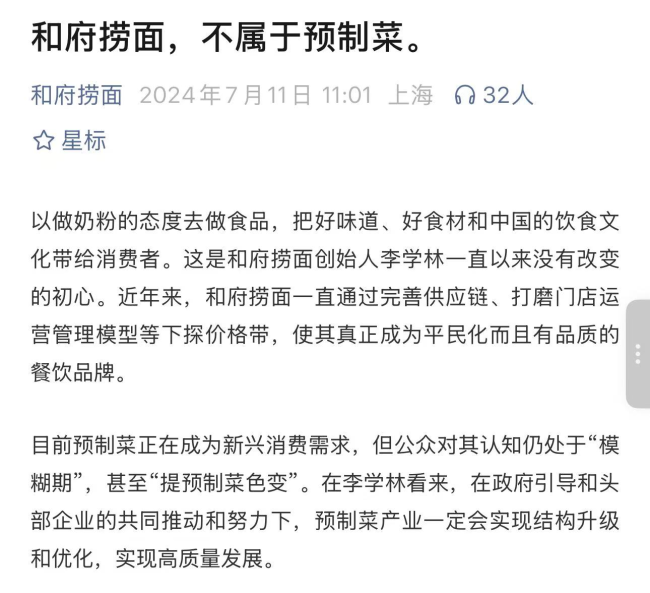 西贝之后,另一知名餐饮品牌和府捞面再次陷入“预制风波”。