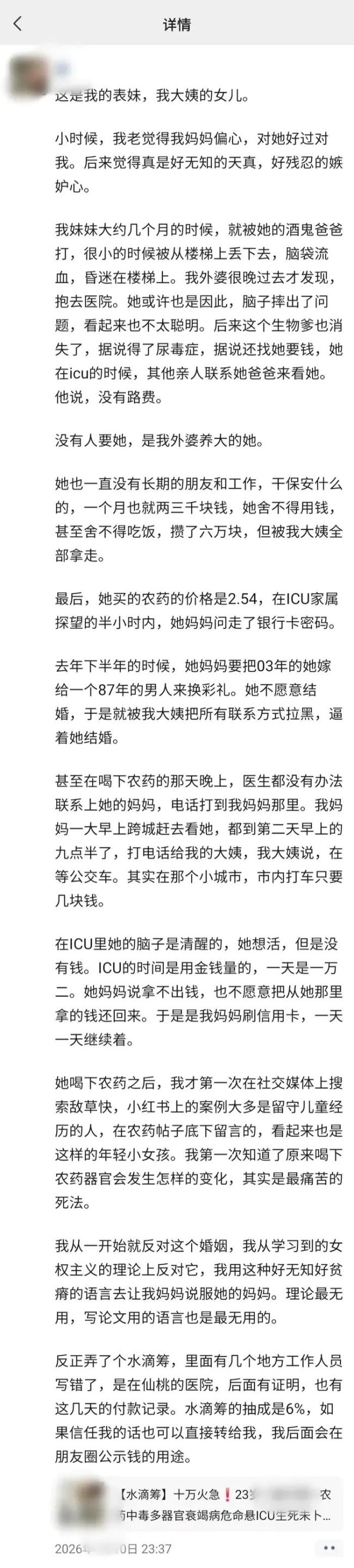 据求助者描述,去年下半年,这名女子的母亲要求她嫁给1987年出生的男子,但女子不愿接受这一安排,结果被母亲拉黑并逼婚。女子随后喝下敌草快轻生,被紧急送往仙桃第一人民医院,后转至武汉华中科技大学同济医院附属协和医院继续治疗。目前医疗费用由求助者的母亲通过信用卡支付,但后续治疗预计还需20万元。