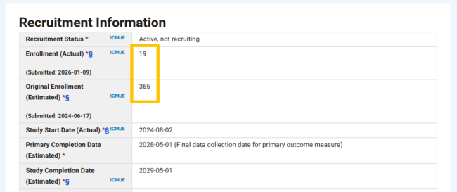 近日,动脉网查询ClinicalTrials官网信息发现,辉瑞一款名为PF-08052666/SGN-MesoC2的MLSN ADC药物临床试验状态变更为“主动,非招募”,计划招募人数从预计的365例骤然缩减至实际的19例。