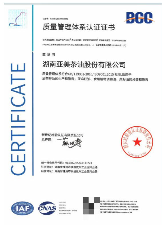 目前,亚美茶油已构建起集种植、研发、生产、销售于一体的全产业链发展体系,为行业树立了标准化、规模化发展的标杆。企业投资3亿元打造亚美油茶智能产业园,实现茶油年加工能力2.4万吨、油茶鲜果日加工能力100吨,充氮保鲜恒温储存量达6500吨,先后获评全国放心粮油示范加工企业、湖南省专精特新“小巨人”企业等。旗下核心茶油产品通过中欧美日四国有机认证与ISO国际质量体系认证,以严苛的品控标准筑牢了产品品质与产业发展的坚实根基。