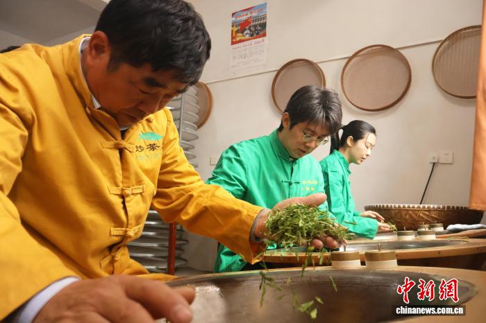 西湖龙井炒茶大师”俞子良(左)及年轻炒茶人炒制西湖龙井茶青叶。中新社记者 鲍梦妮 摄