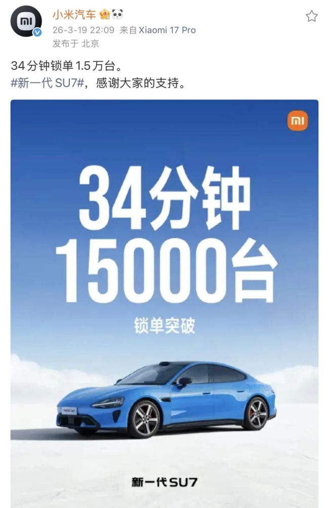 小米汽车官方微博数据显示,上市后仅34分钟就锁定了1.5万台订单。