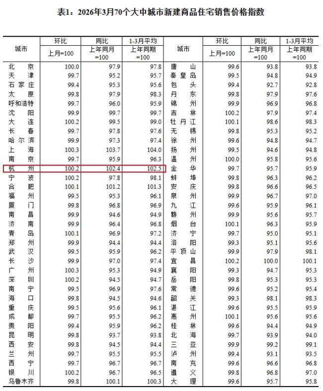 国家统计局公布了3月70个大中城市的价格变动情况。杭州3月新房价格环比上涨0.2%,与上月持平;同比上涨2.4%,较上月收窄。二手房价格环比下跌0.1%,跌幅略有缩小;同比下跌5.2%,跌幅继续扩大。