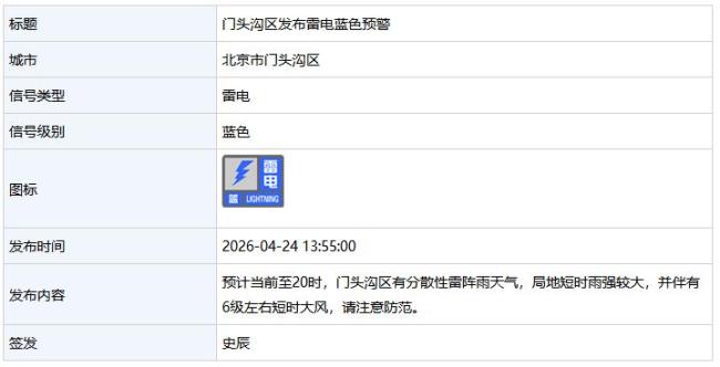 门头沟区发布雷电蓝色预警 局地短时雨强较大请注意防范
