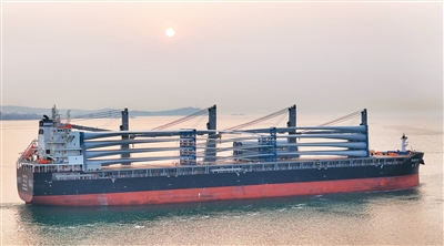3月28日,7套国产风电设备在山东港口烟台港蓬莱港区完成装船并发往奥地利。随着中国风电企业不断拓展欧洲市场,烟台港目前已形成月均两班的欧洲风电设备发运频次。图为装载着出口奥地利风电设备的货轮从山东