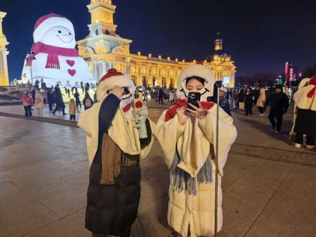 2日晚,哈尔滨音乐公园的“大雪人”前游客络绎不绝。一位身着雪人造型羽绒外套的女孩拿出20多套雪人斗篷,免费提供给游客拍照。这位女孩名叫张欣,是一名90后创业者,她已经连续三年为游客提供这种独特的拍照服装