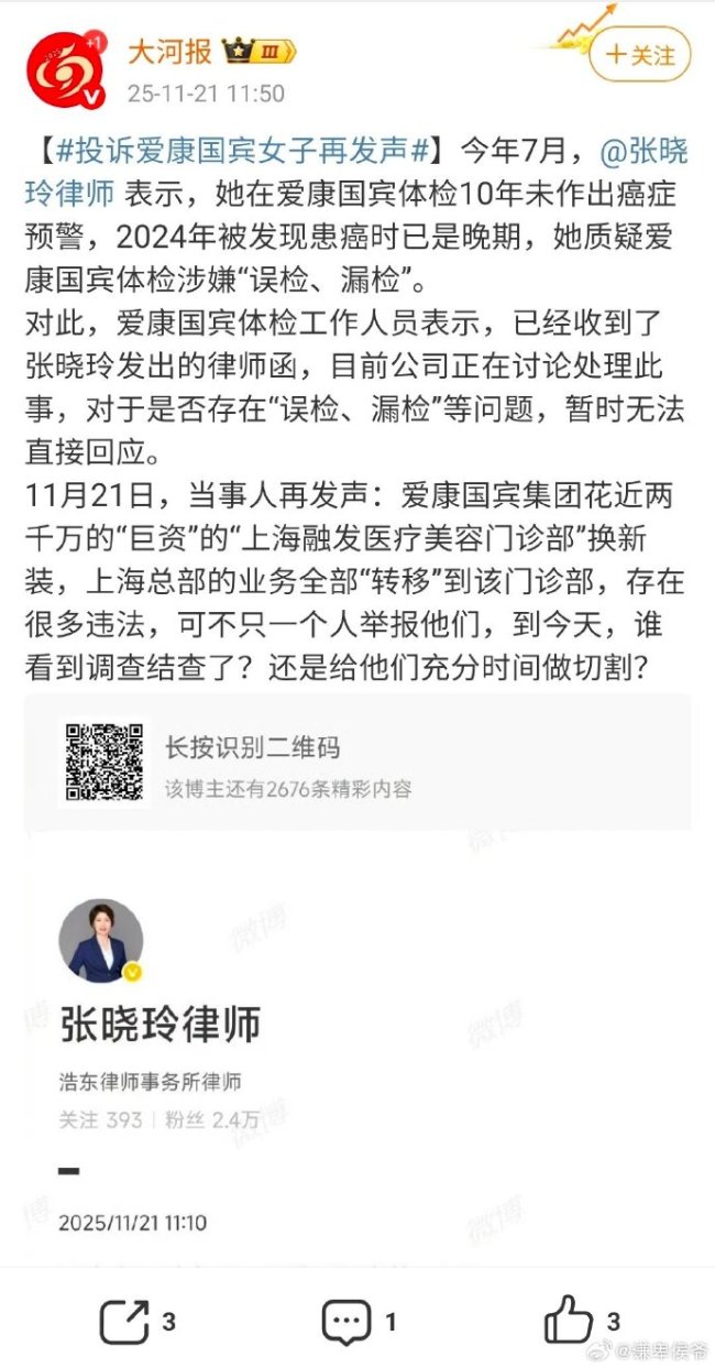 在爱康国宾体检10年未作出癌症预警、2024年被发现患癌时已是晚期的张晓玲律师,针对她质疑的爱康国宾体检涉嫌“误检、漏检”,当事人再发声:爱康国宾集团花近两千万的“巨资”的“上海融发医疗美容门诊部”换新装,上海总部的业务全部“转移”到该门诊...