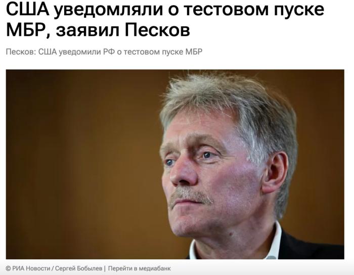 中新网11月6日电 据俄新社、俄罗斯卫星通讯社报道,当地时间11月5日,俄罗斯总统新闻秘书佩斯科夫表示,美方在试射“民兵3”洲际弹道导弹之前,提前向俄罗斯通报了相关信息,俄方将继续履行《全面禁止核试验条约》中