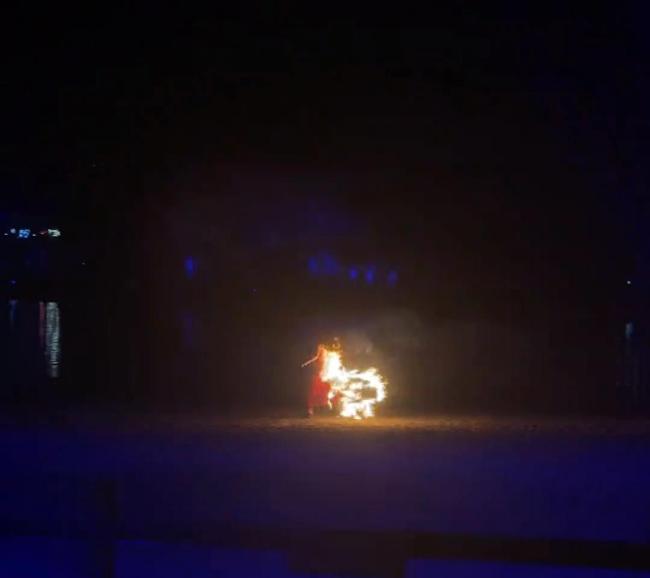 4月2日晚,南通森林野生动物园内的一场演出发生了意外。一名女子在火圈内表演时,裙子不慎被点燃,她迅速跑向表演场地后方的水池并跳入水中灭火。游客拍摄的视频显示,女子身穿红色连体长裙,在两名男子手持火把点燃火圈后开始表演