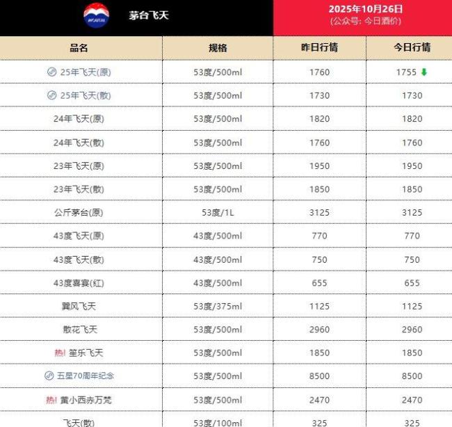 格隆汇10月26日|今日酒价披露的批发参考价显示,10月26日,25年飞天茅台原箱较前一日下跌5元,报1755元/瓶;25年飞天茅台散瓶较前一日持平,报1730元/瓶
