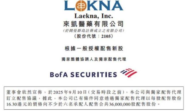 2025年9月10日,来凯医药(Laekna,股票代码:2105.HK)公告。