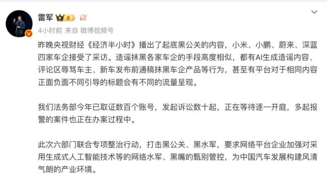 近日,央视财经播出了关于黑公关的调查报道,小米、小鹏、蔚来和深蓝四家车企接受了采访。雷军在9月13日发文称,法务部今年已对数百个账号进行取证,并发起了数十起诉讼