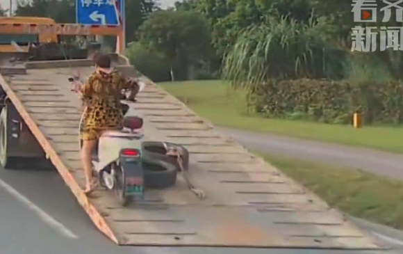 • 女子骑电动车冲上路边拖车 拖车:公主请上车
