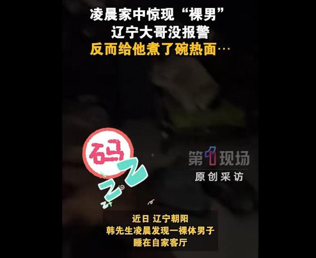 近日,辽宁朝阳的韩先生凌晨发现一名裸体男子睡在自家客厅。经了解,这名男子因醉酒走错门,还遗失了手机和外套,当时气温低至零下十几度。韩先生看到男子尚未完全清醒,担心他会冻死,决定帮助他。韩先生不仅给男子倒水煮面,还让他留宿了一晚
