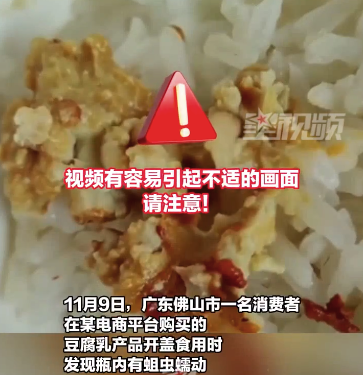 11月9日,广东佛山市一名消费者在某电商平台购买的豆腐乳产品开盖食用时,发现瓶内有蛆虫蠕动。10日,涉事电商平台回应称,经核实产品确有蛆虫问题,已和消费者达成和解并完成赔偿。平台方面表示,问题可能出现在产品灌装或运输过程中瓶盖密封不严导致漏...