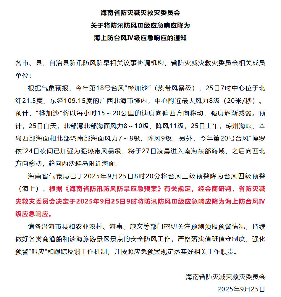 中新网9月25日电 据“海南应急管理”微信公众号消息,海南省防灾减灾救灾委员会9月25日发布通知,根据气象预报,今年第18号台风“桦加沙”(热带风暴级),25日7时中心位于北纬21.5度、东经109.15度的广西北海市境内,