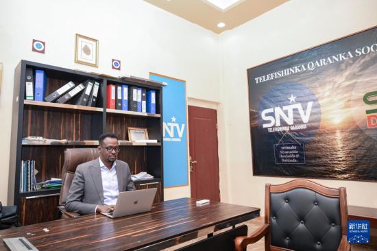1月12日,在索马里首都摩加迪沙的索马里国家电视台,台长穆罕默德·卡菲·谢赫·阿布卡尔在办公室工作。新华社记者杨光摄索马里国家电视台是该国最主要的公共广播电视机构之一,向全国及海外受众提供新闻、教育、