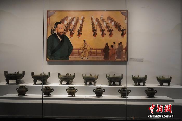 图为展出的春秋时期七鼎六簋青铜器。中新社记者 韩章云 摄 图为观众参观展出的青铜器。中新社记者 韩章云 摄