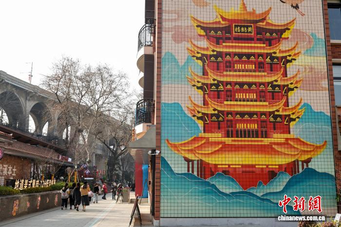 2月12日,湖北武汉,春节将至,武昌古城斗级营街区张灯结彩,处处洋溢着喜庆祥和的节日氛围。街区精心打造“抬头见黄鹤楼”的特色打卡场景,还可与武汉长江大桥同框,吸引大批市民游客前来打卡游玩。图为游客在武昌